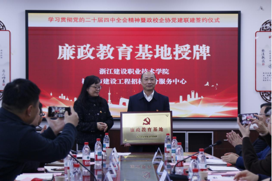 11月20日,一场汇聚政校企协多方力量的党建联建活动在学校萧山校区隆重举行。建筑工程学院党总支、杭州市建设工程招标造价服务中心党总支与杭州市建设工程招标造价管理协会党委携手,以“学习贯彻党的二十届四中全会精神”为核心主题,签署党建联建协议,揭牌廉政教育基地,成立“青廉说”宣讲团,为建设行业廉洁人才培养开辟协同育人新路径。学校党委委员、纪委书记来丽芳出席活动并致辞。