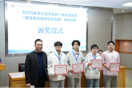 11月28日至29日,2025年浙江省中高职一体化试点赛“建筑信息模型技术应用”赛项在我校成功举办。来自全省的20支队伍60名选手同台竞技,扬青春风帆,展职教风采。每支队伍由2名中职学生和1名高职学生组成。我校代表队在比赛中表现出色,建工学院陈朝老师共同指导的参赛队荣获一等奖、张尹老师共同指导的参赛队荣获三等奖。